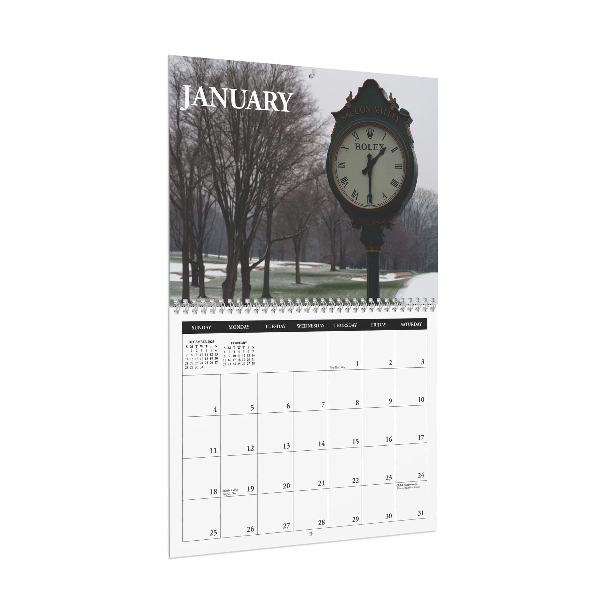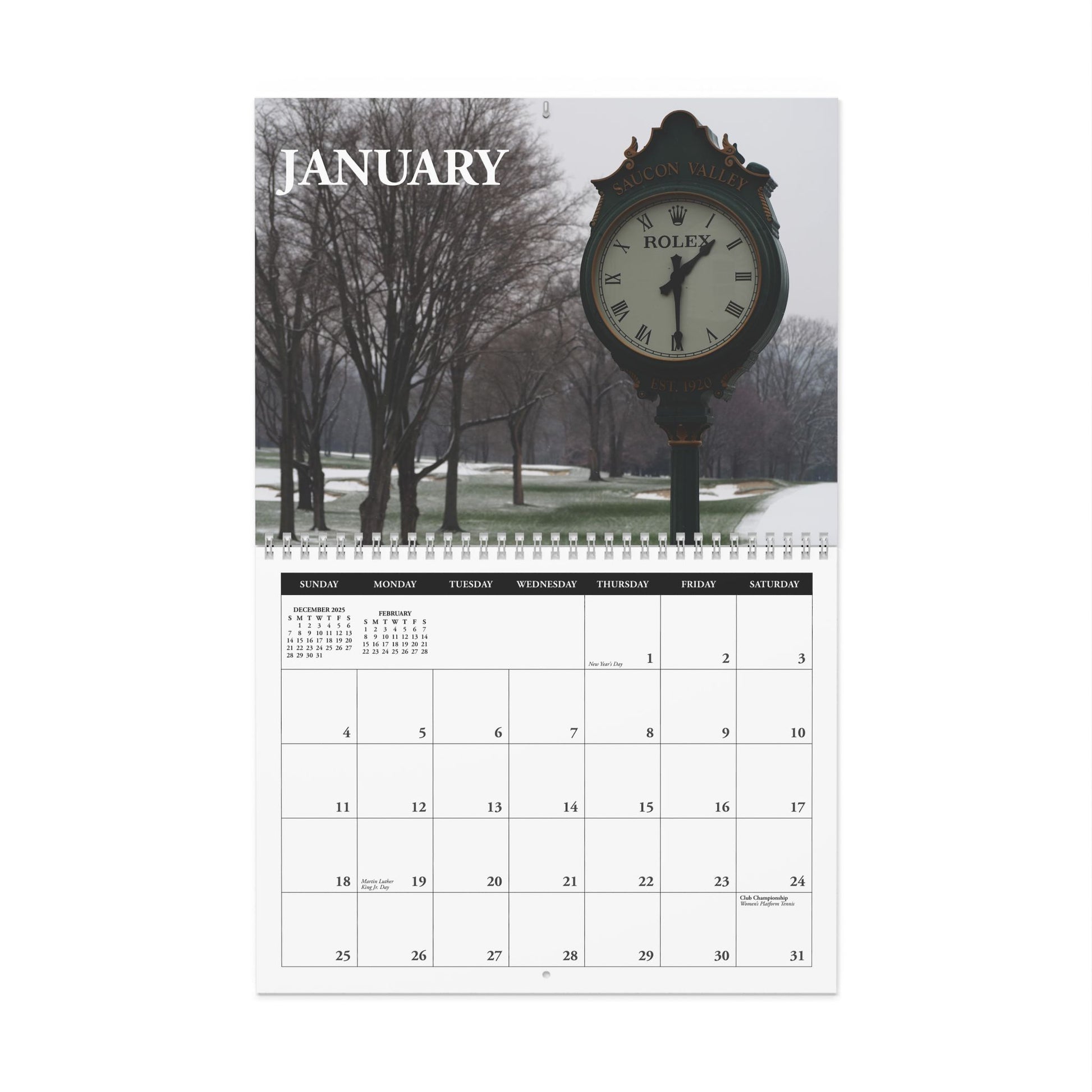 Keep track of every Club event with the 2026 Saucon Valley Country Club desktop calendar. Made with high-quality paper stock, you get large, vibrant images for each month that you can truly enjoy looking at. All calendars come with spiral binding for easy flipping over, while the centered hole makes this calendar a breeze to hang on any wall.
